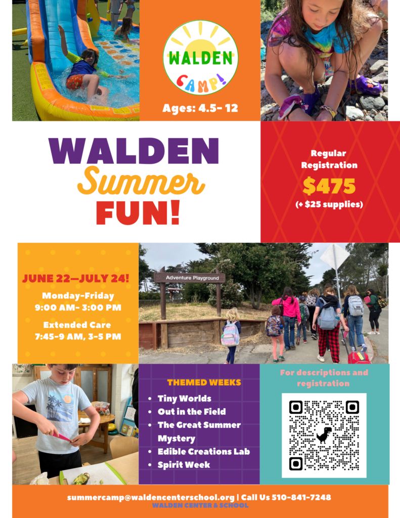 Welcome to Walden’s Summer Camp! We aim to support kids in building friendships and a community that connects us to our sense of adventure. At camp, kids stretch their imaginations, enjoy Walden’s beautiful campus, and play creatively with one another. Each week has a different theme. Please note that Walden is a nut-free campus!